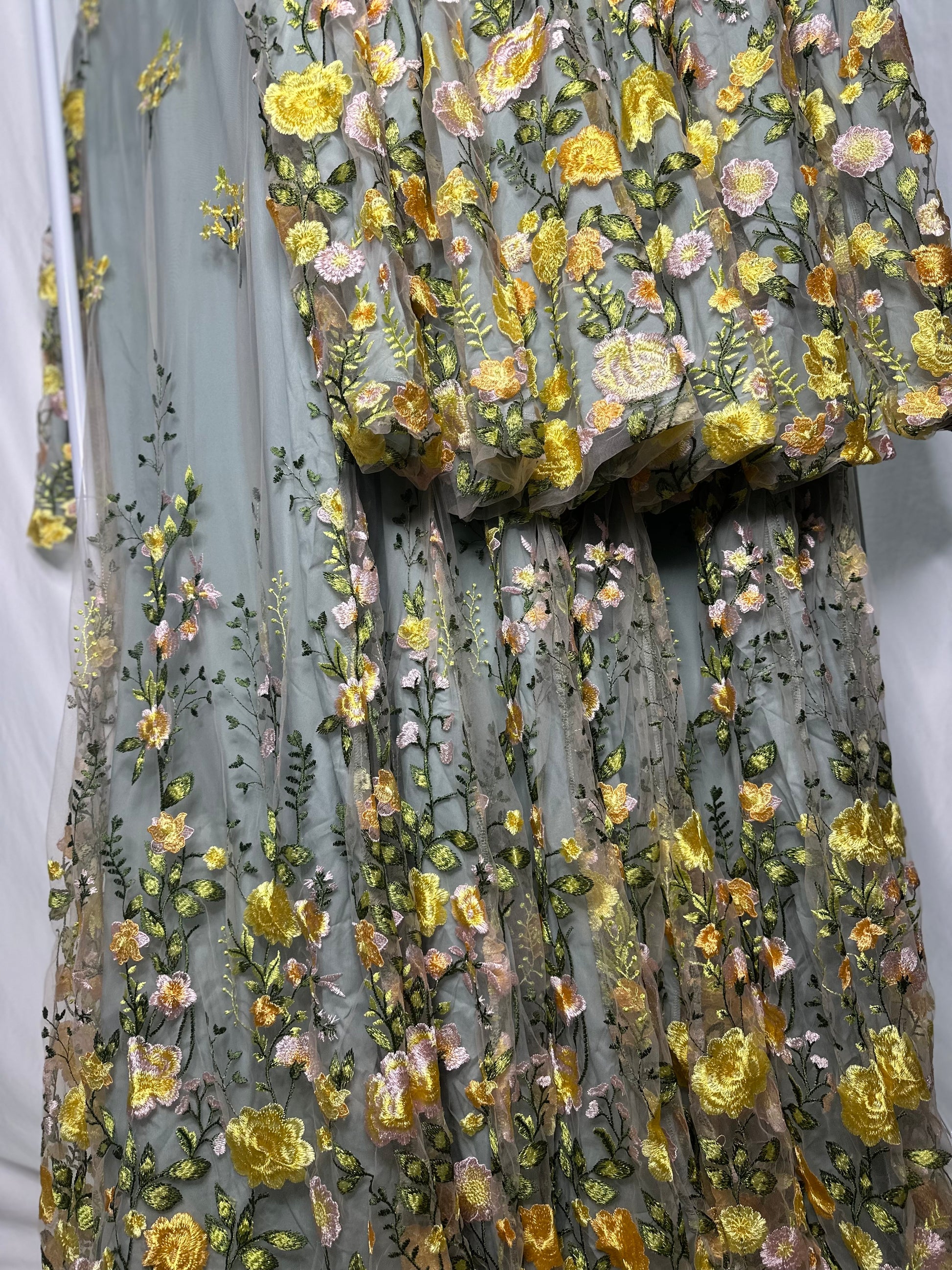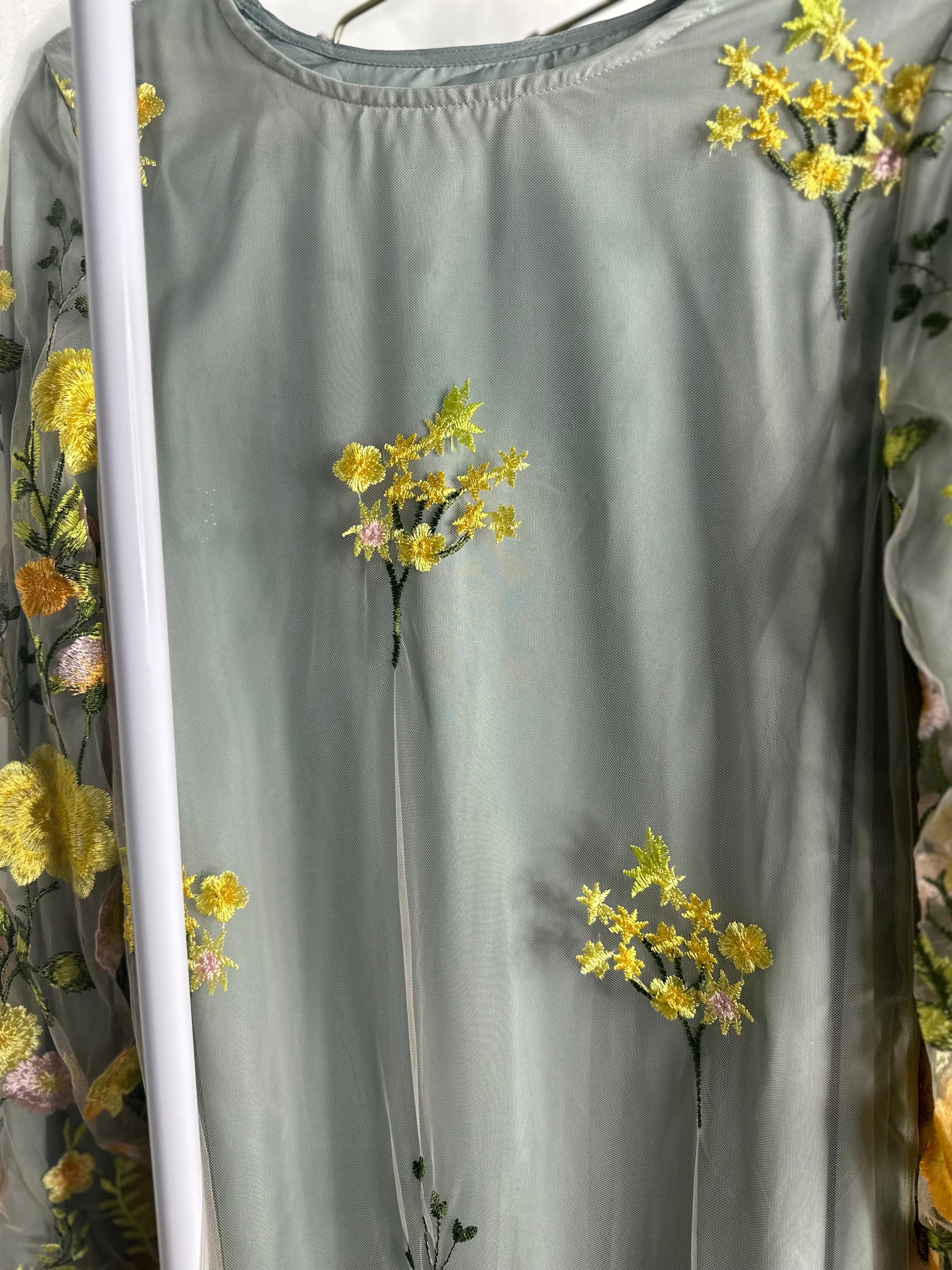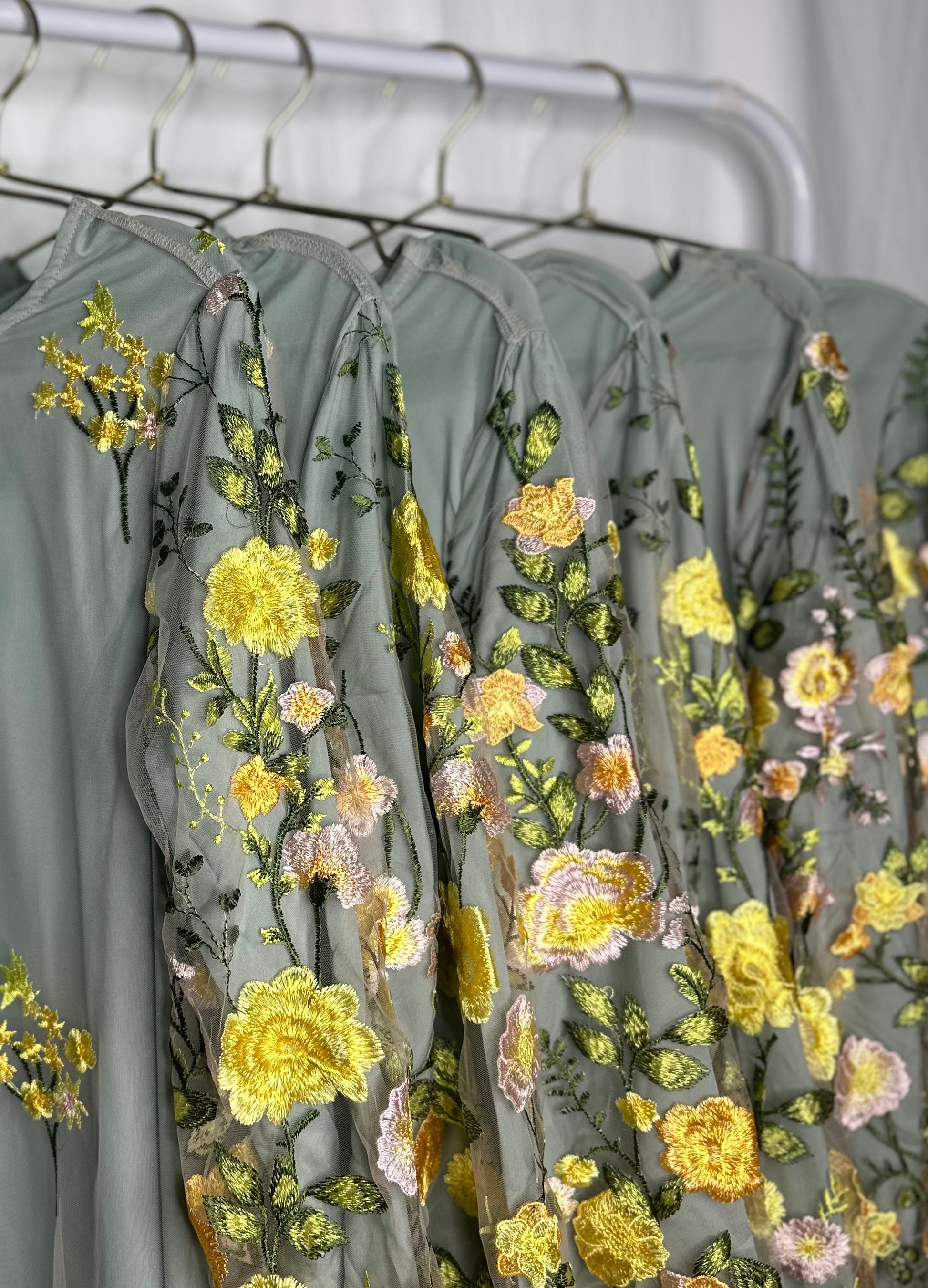 The long sleeve slip dress offers a graceful silhouette, while the embroidery in mint green, yellow, and sunshine hues adds a refined, vibrant touch.